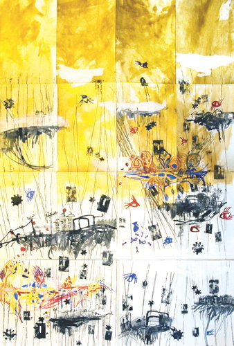Seria rysunków inspirowana książką Olgi Tokarczuk Anna In w grobowcach świata. Mój ulubiony motyw podróży tym razem jako droga pokonywana windami, w górę i w dół, między czarnymi wyspami dolnego świata a kolorowymi wyspami górnych poziomów.